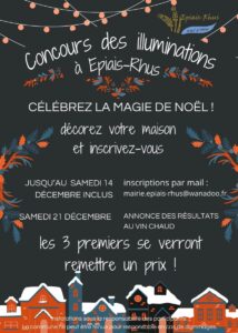 La Mairie propose aux habitants de la commune d’Epiais-Rhus, de participer à un concours d'illuminations et décorations de Noël. Ce concours a pour but de donner aux fêtes de fin d’année une ambiance féérique et lumineuse.